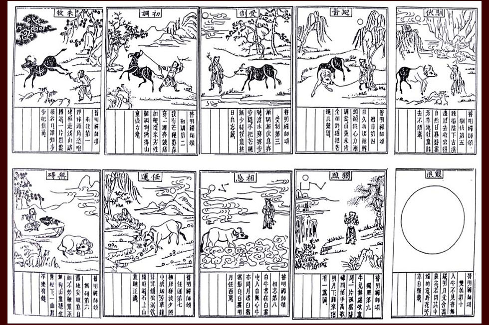 the ten ox-herding pictures by the twelfth century Linji Chan master Guoan Shiyuan (J. Kakuan Shien 廓庵師遠 n.d.). These ten images sequentially show how the boy-novice tames the unbridled power of the Buddha-bull-mind in meditation (frames 1-6), realizes its fundamental emptiness (frames 7-8), and then re-emerges from the rigors of the experience back into the world as a grown master (frames 9-10).